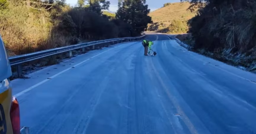 Alguns pontos da SC-112, em Urupema, na Serra catarinense, amanheceram congelados nesta quinta-feira, 3. Segundo a Defesa Civil, o município registrou -5ºC entre 2h e 6h.