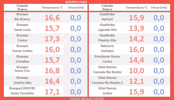 Na tabela a seguir, apresentamos as temperaturas mínimas registradas logo após o amanhecer, destacadas em vermelho para cada local monitorado.