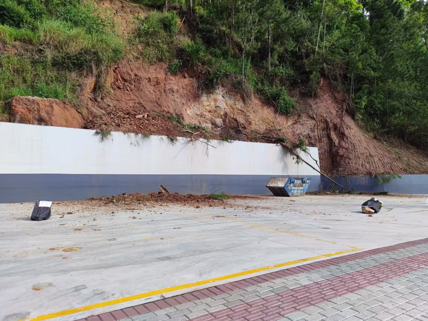 O morro ao lado da unidade das Farmácias São João no bairro Santa Rita deslizou e a terra caiu sobre o estacionamento da farmácia. A situação foi registrada devido às chuvas que atingem Brusque e região nos últimos dias. Uma foto mostra a situação nesta sexta-feira, 13, por volta das 7h50.