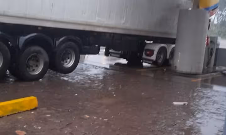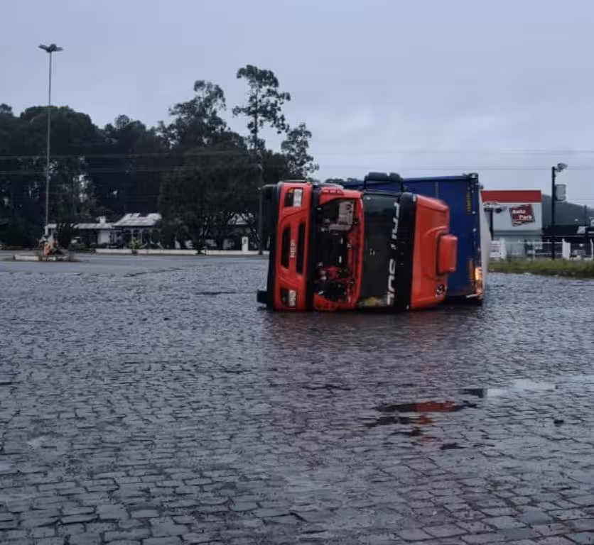 Imagens enviadas por leitores, via Rádio Tangará, mostram que até uma carreta foi derrubada pela força do vento. O fato se deu junto a um posto de combustíveis, às margens da BR-282.
