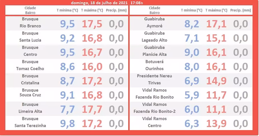 Em Brusque, os picos do domingo no turno vespertino não passaram da casa dos 17ºC, apesar da presença do sol que brilhou de forma absoluta.