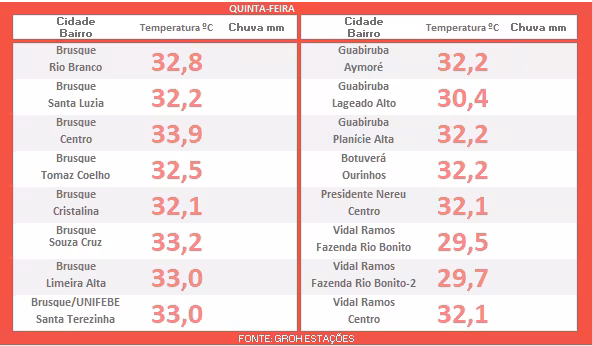 O ponto mais alto de temperatura de toda a região foi então identificado no Centro de Brusque, alcançando 33,9°C. Convidamos você a conferir a lista completa.