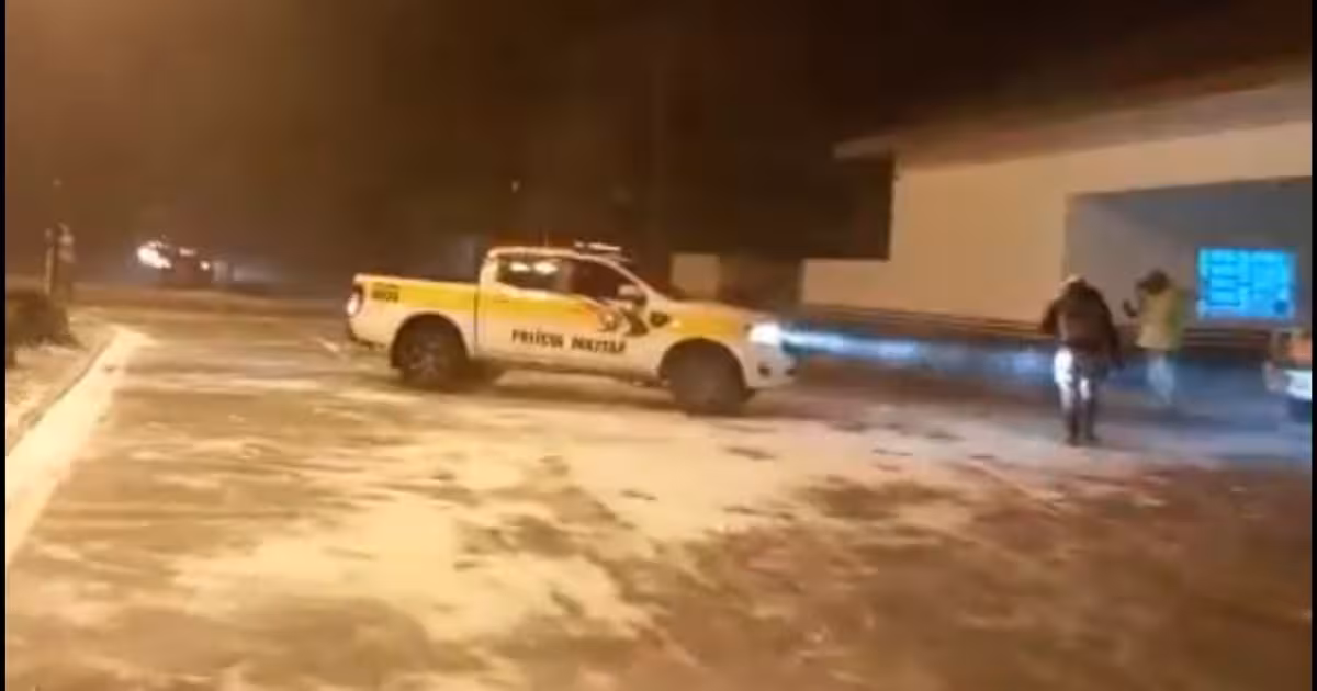 Na noite desta quarta-feira, 28, foi registrada neve e vento forte na rodovia SC-390, na Serra do Rio do Rastro. O vídeo foi feito na frente do Posto 21 da Polícia Militar Rodoviária (PMRv), em Bom Jardim da Serra.