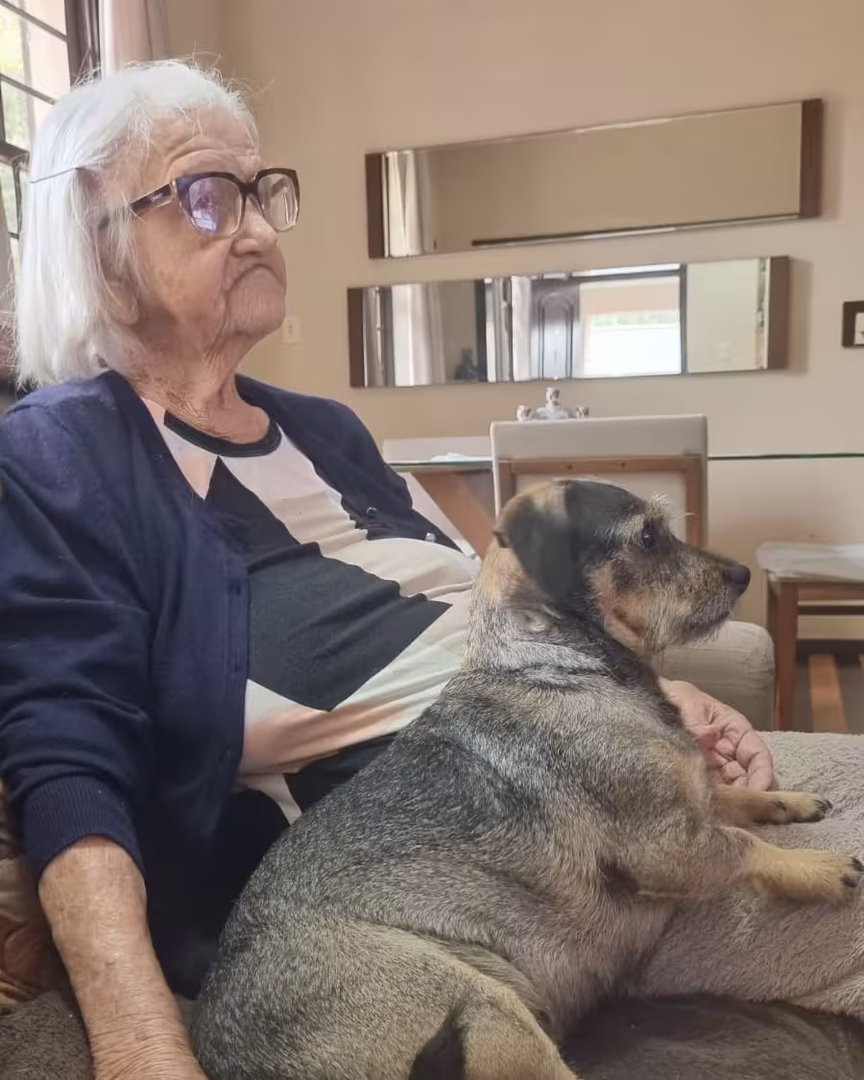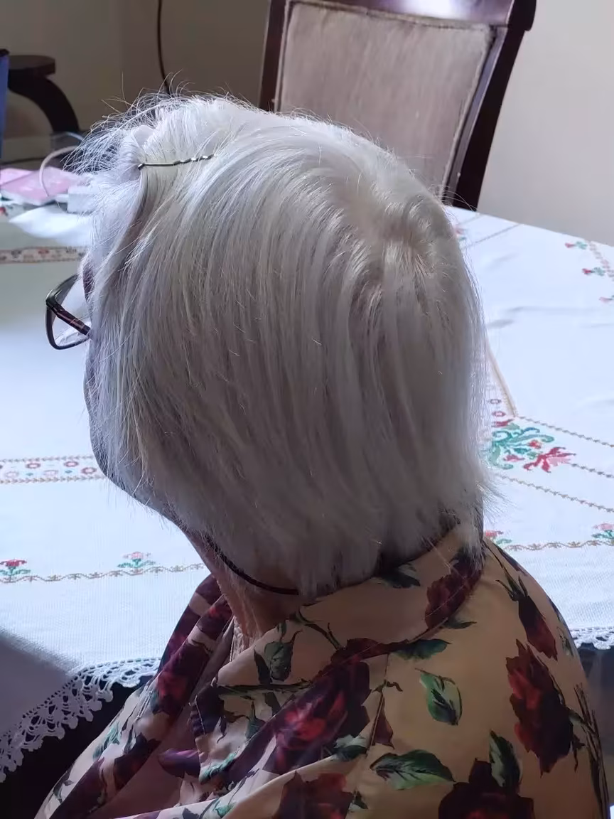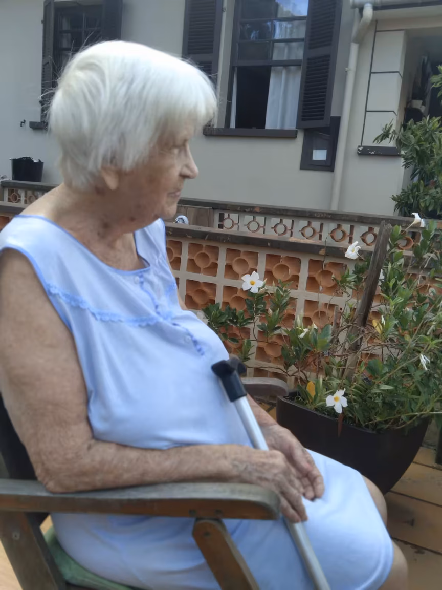 Com o apoio zeloso de filhos e netos, ela continua realizando seus cuidados pessoais, mantendo o olhar atento sobre o mundo ao seu redor.