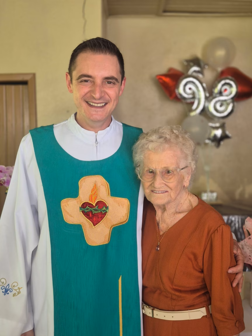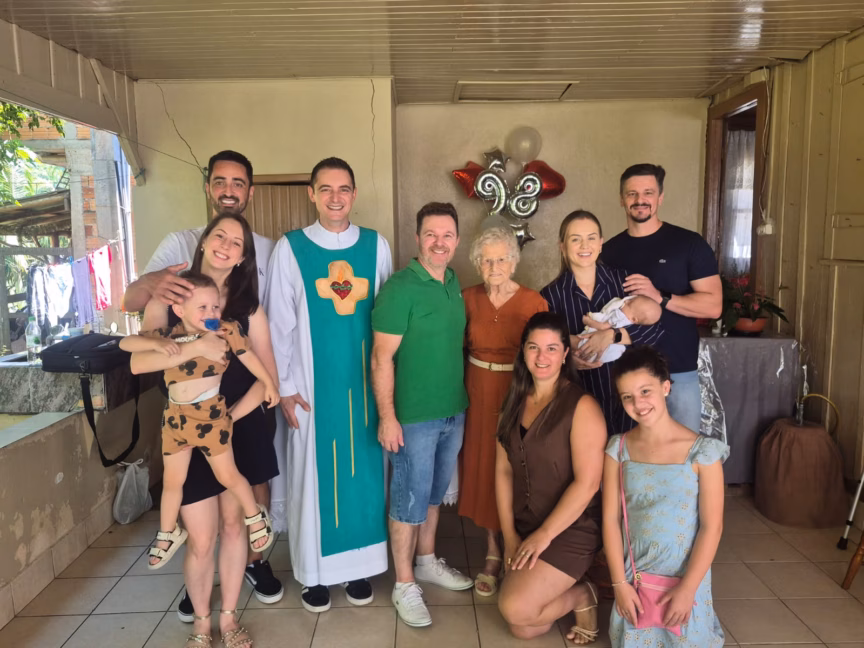 Antecipando o aniversário de 98 anos de Ágatha Domingas Colombi Maestri — ou simplesmente nona Ágatha, como é carinhosamente chamada em referência à posição de matriarca — familiares e amigos se reuniram em sua residência, no Centro da cidade, para um dia de emoção e fé.