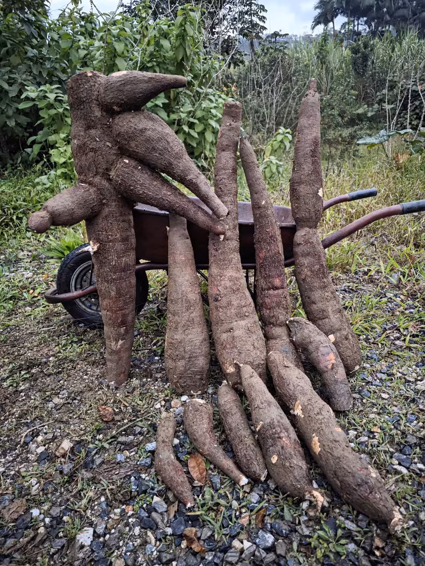 Ao ser desenterrada, com o auxílio de um enxadão, a mandioca acabou se despedaçando pela dificuldade de ser removida inteira, dada a dimensão incomum que havia alcançado.
