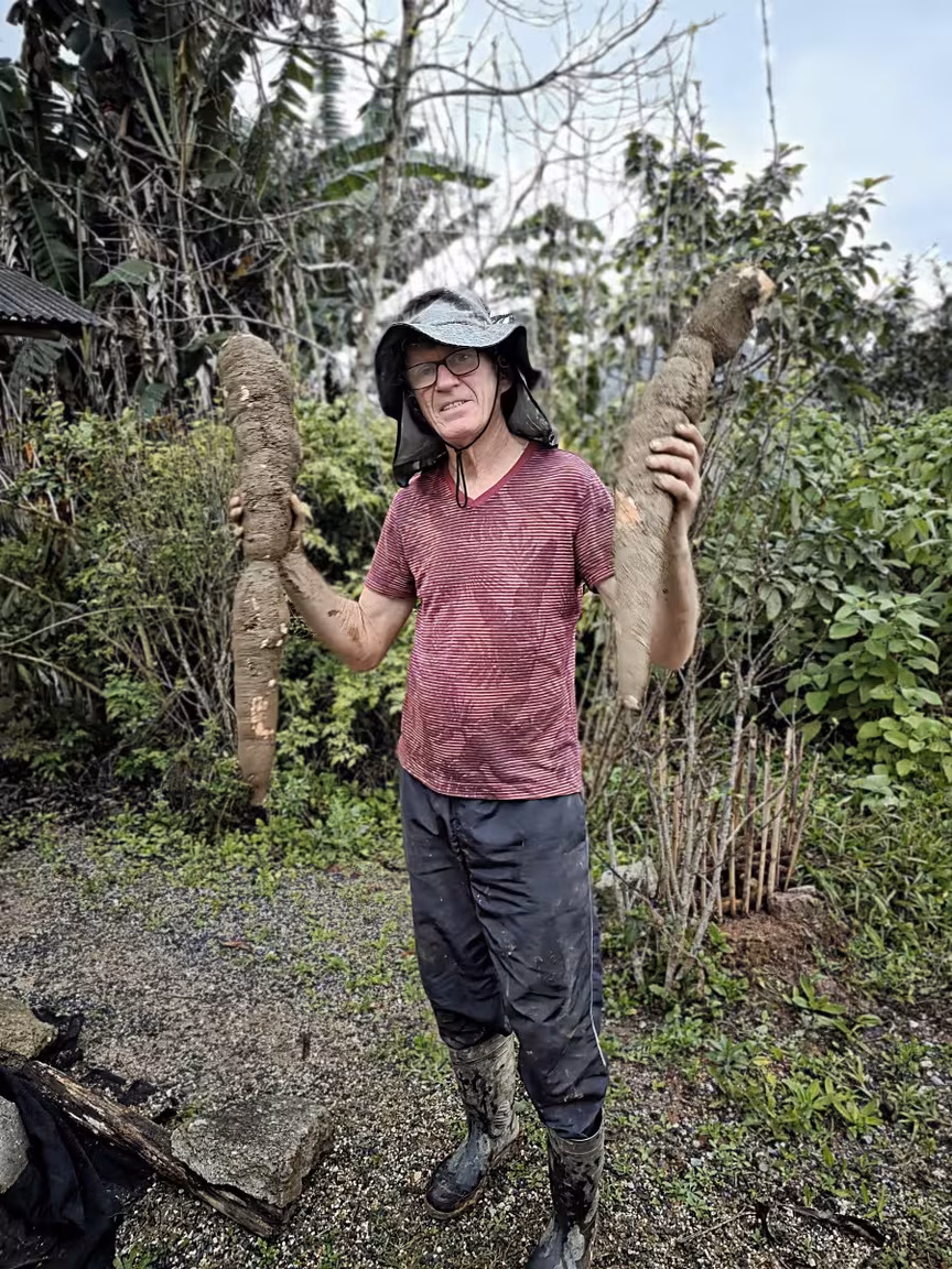 As imagens mostram não apenas a imensa raiz colhida, mas também retratam a diversidade e a beleza do espaço onde Osni cultiva seus alimentos com a mesma paixão herdada de gerações.