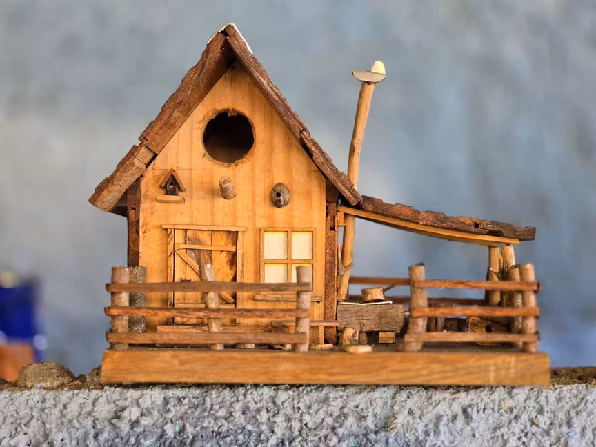 Algumas das casinhas apresentam varandas, áreas de apoio e compartimentos internos pensados para facilitar o abrigo e a circulação dos pássaros.