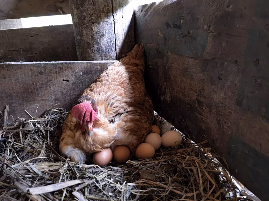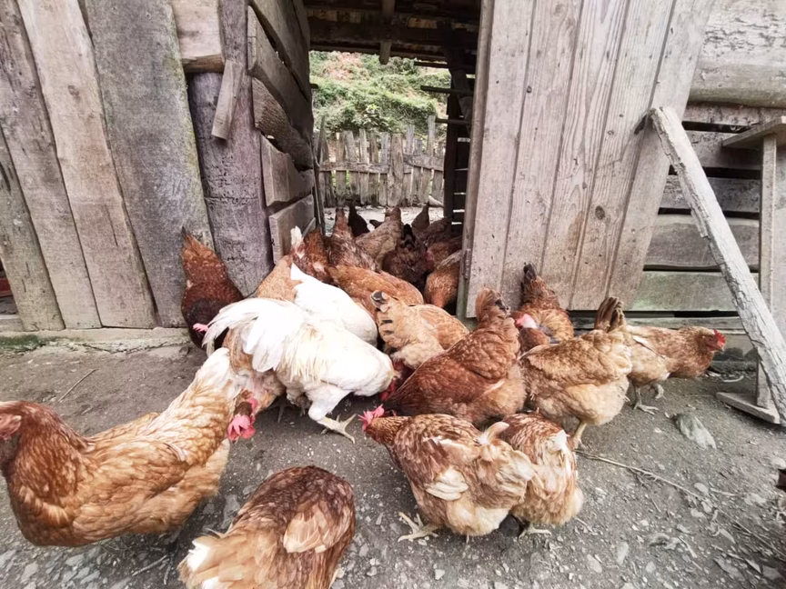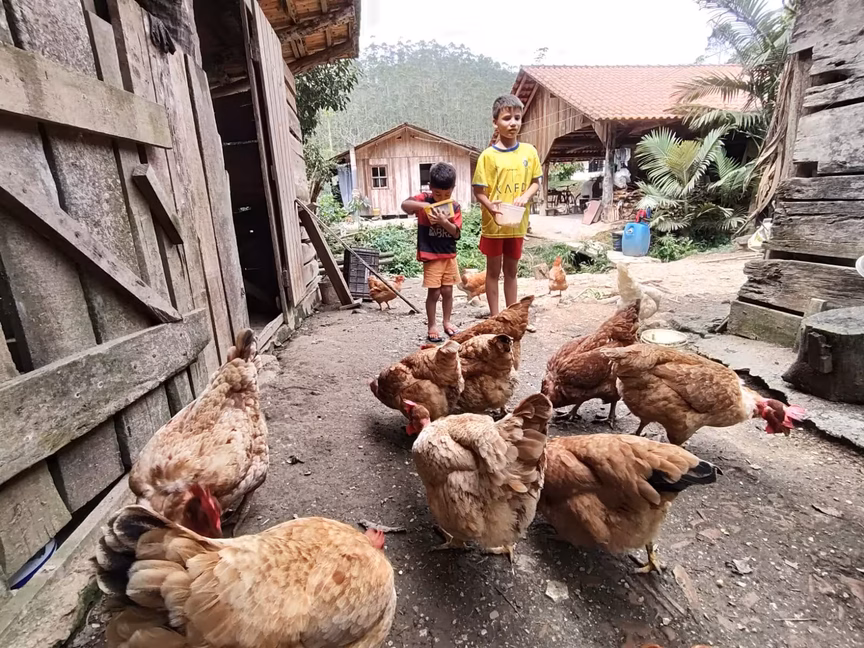 As galinhas, sempre perambulando livres pelo quintal, garantem ovos fresquinhos, completando o ciclo de vida saudável que praticam.