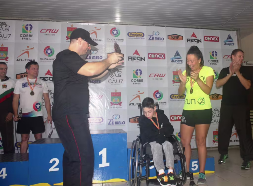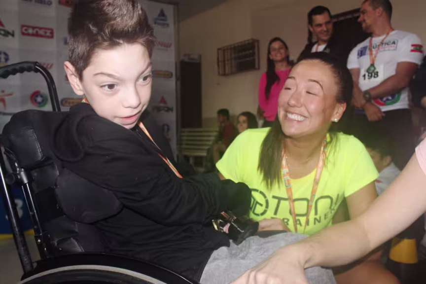 Essa foi a primeira vez que o garoto participou de uma competição acompanhado da madrinha. A dupla treinou antes da competição para ter uma dimensão das dificuldades que enfrentariam. “Com a hidrocefalia ele ficou com a cabeça amolecida, e meu medo era que isso atrapalhasse de alguma forma, mas ele mesmo conseguiu se segurar sozinho na cadeira e deu tudo certo”, diz.