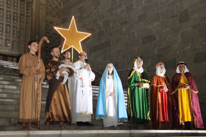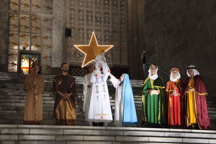 A pastoral escolar também ganhou destaque, com alunos e colaboradores encenando os personagens da história: Maria, José, os Três Reis Magos e os pastores, dando vida ao presépio que se formou no alto da escadaria, com a estrela sempre brilhando.