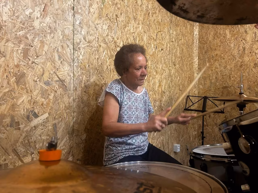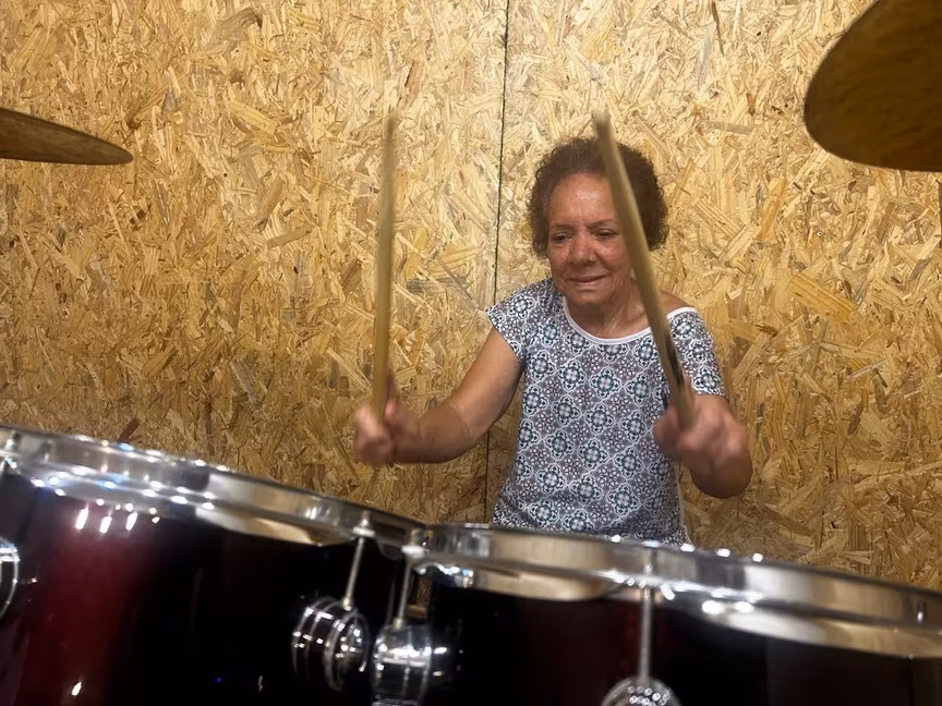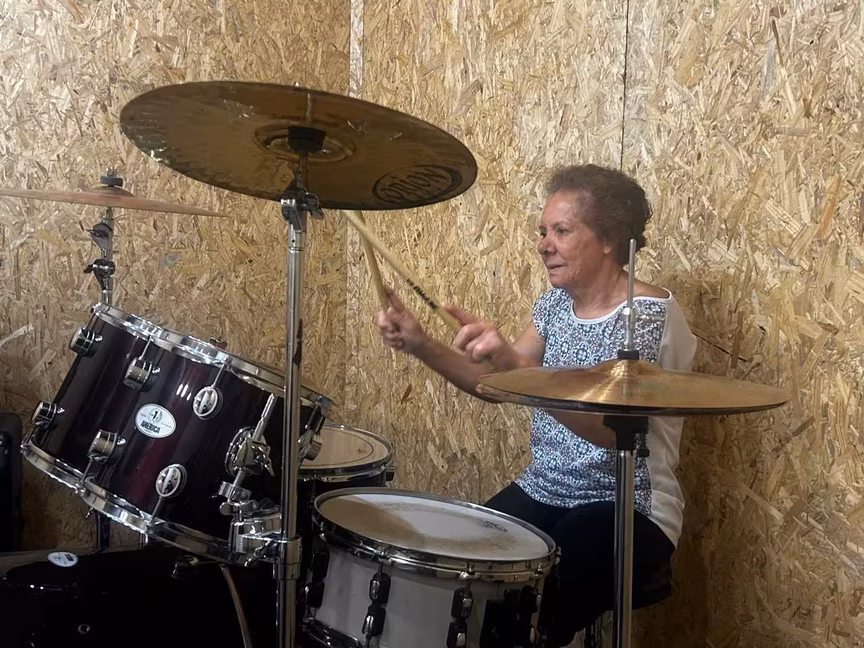 Conheça idosa que realizou sonho de aprender a tocar bateria em Brusque