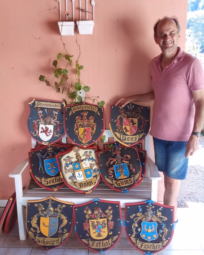 No quintal de casa, repleto de latas de tinta e pinceis, o escultor Karl Theichmann faz brasões para as famílias de Brusque e região. Ao jornal O Município, o artista conta o processo de fabricação dos brasões e sobre a exposição de alguns no Museu do Imigrante Alemão, localizado na Casa Scharf, em Guabiruba.