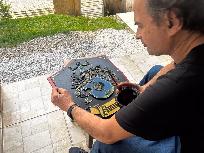 Conheça trabalho de escultor de Brusque que cria brasões para famílias da região