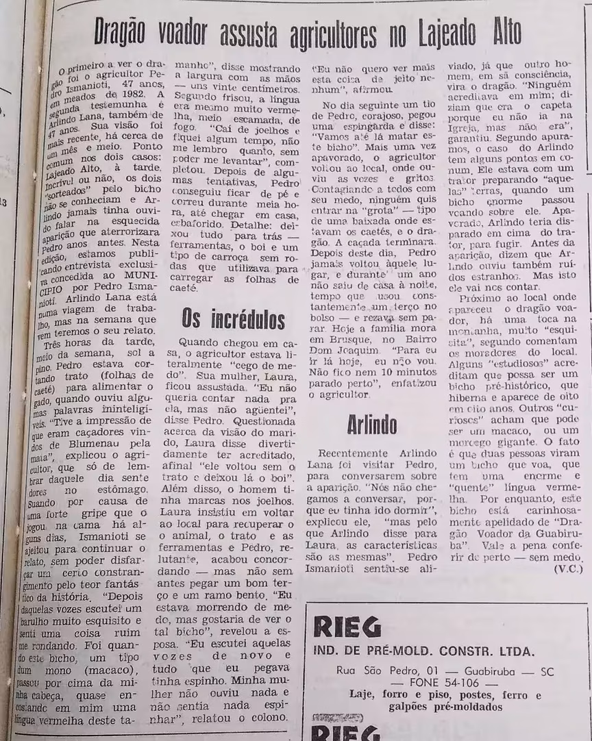 Dragão de Guabiruba: veja o primeiro relato do “criador” da lenda em 1990