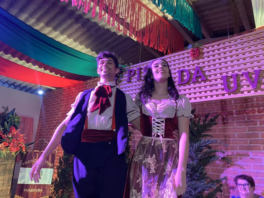 Os olhos atentos das crianças evidenciam o encantamento pelo Show da Pisa da Uva na 10ª Festa Italiana de Guabiruba. Acompanhadas pelos pais, que também assistiram empolgados ao show no Salão Santo Antônio, no Lageado Alto, os pequenos testemunharam a tradicional apresentação cultural na noite deste sábado, 11.