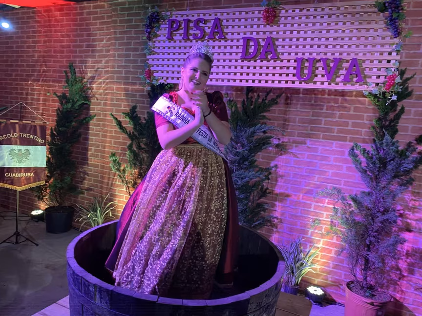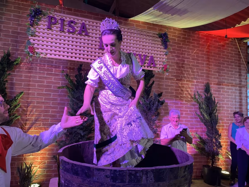 A rainha Maria relata que já fez a Pisa da Uva em festas anteriores, inclusive já realizou a apresentação de dança que antecede a atração. Ela conta que a experiência da uva é bem diferente.