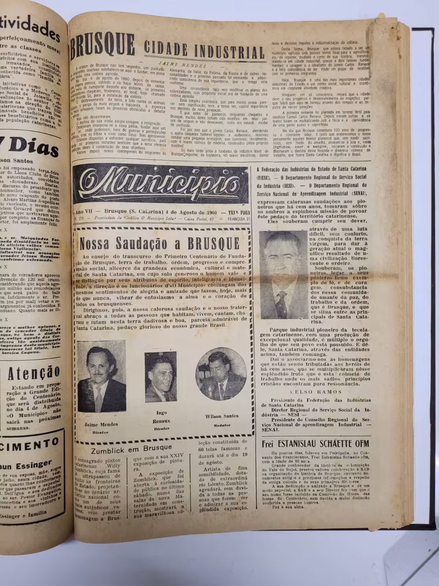 Brusque completou 100 anos no dia 4 de agosto de 1960. O centenário foi destaque de toda a edição impressa. A capa não ficou de fora das comemorações do dia da cidade. O maior destaque é a saudação da equipe do jornal a Brusque. O texto “Nossa saudação a Brusque” é assinado pelos diretores Jaime Mendes e Ingo Renaux, além do redator Wilson Santos.