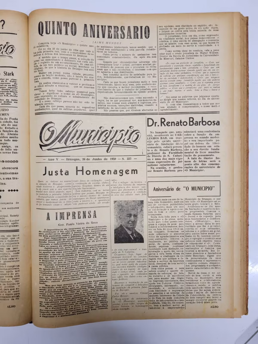 Cinco anos após a primeira edição, a capa destaca o aniversário do jornal O Município, celebrado em 26 de junho de 1959. A edição daquele dia é aberta com um texto que tem como título “Quinto aniversário”, escrito pelo então diretor do jornal, Jaime Mendes.