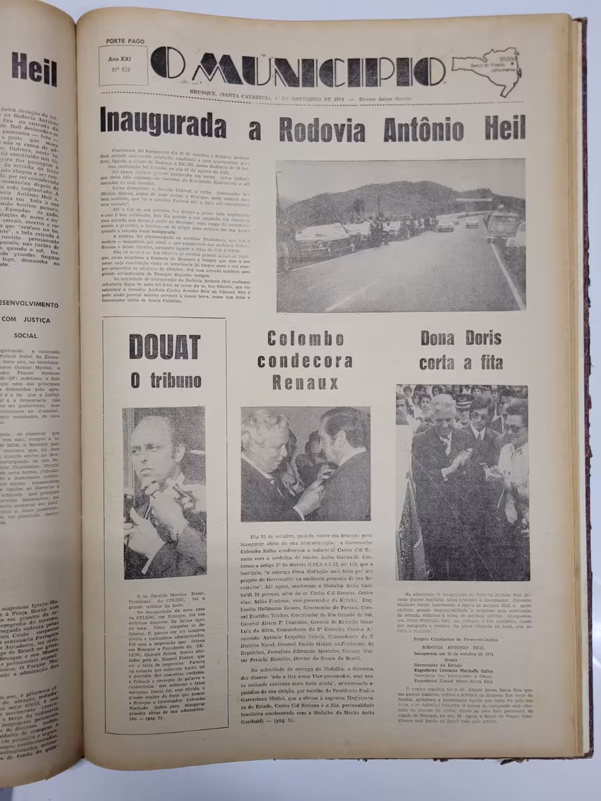Em 1974, no dia 25 de outubro, a rodovia Antônio Heil, que liga Brusque à BR-101, foi inaugurada. Na capa do dia 1º de novembro, consta que tratava-se de uma “estrada totalmente asfaltada, sinalizada e com acostamento perfeito”. O então governador de Santa Catarina, Colombo Machado Salles, marcou presença em Brusque para a inauguração.