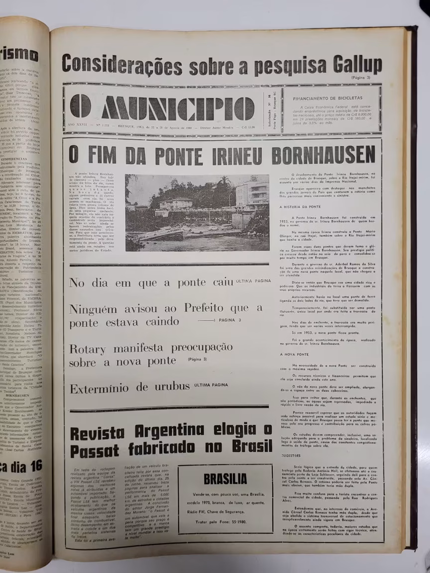 Um dos fatos mais marcantes de Brusque é, talvez, a queda da ponte Irineu Bornhausen com 11 carros, no dia 8 de agosto de 1980. O acidente foi assunto na capa do dia 22 de agosto. “O fim da ponte Irineu Bornhausen” é o título. Constam ainda na capa informações sobre a história da ponte, uma nova estrutura para substituir a antiga e sugestões para o trânsito no Centro.
