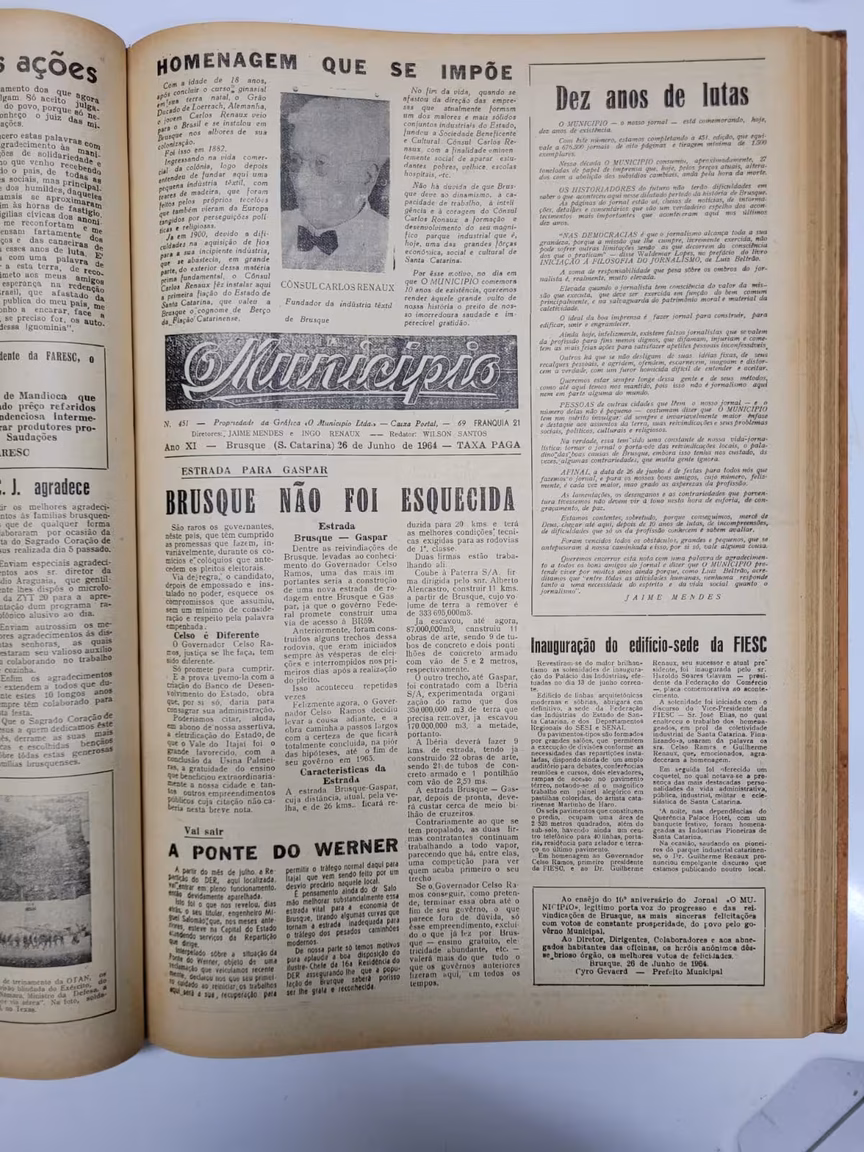 A capa de 10 anos do jornal O Município conta com uma homenagem ao cônsul Carlos Renaux. A infraestrutura ficou com o maior destaque da capa. Uma nota elogiosa ao então governador Celso Ramos aborda a construção de uma nova estrada para ligar Brusque a Gaspar. Uma mensagem do prefeito da época, Cyro Gevaerd, que parabeniza O Município pelos 10 anos também consta na capa.