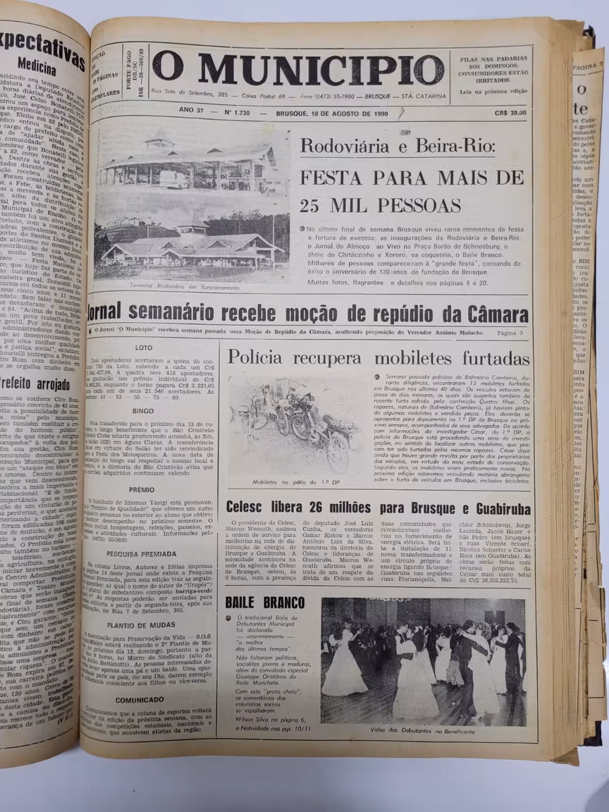 As inaugurações da rodoviária e da avenida Beira Rio são os destaques da capa da edição de 10 de agosto de 1990. A avenida, além de garantir a fluidez do trânsito na cidade, tem papel de atuar como canal extravasor de cheias do rio Itajaí-Mirim, na intenção de evitar transtornos maiores em meio a eventos climáticos.