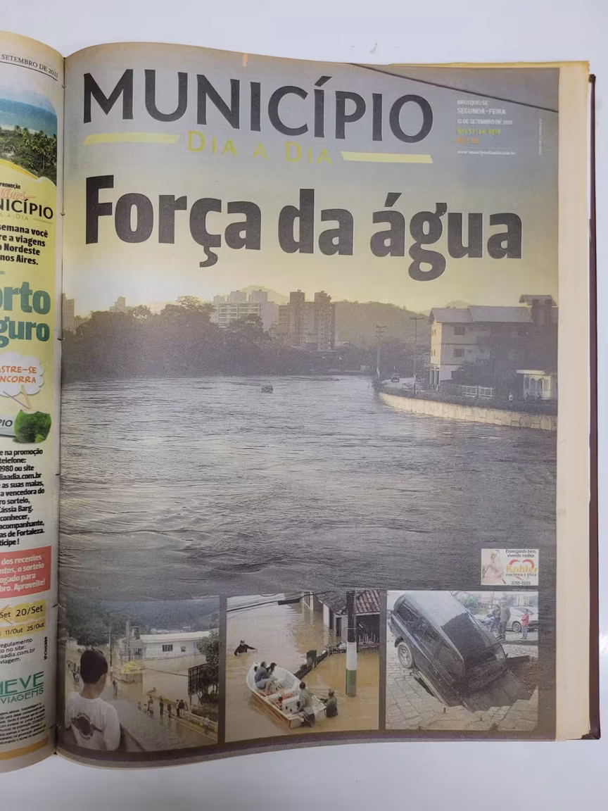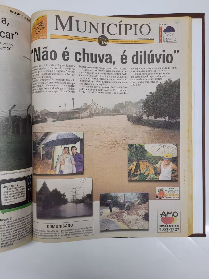 A enchente marcou Santa Catarina em 2008. A capa da edição de 24 de novembro daquele ano tem uma frase citada como título: “‘Não é chuva, é dilúvio’”. Fotos dos estragos pela cidade abrem a edição. Na parte debaixo da capa, consta um comunicado do jornal O Município (na época, Município Dia-a-Dia) que informa transtornos na entrega do jornal impresso naquele dia.