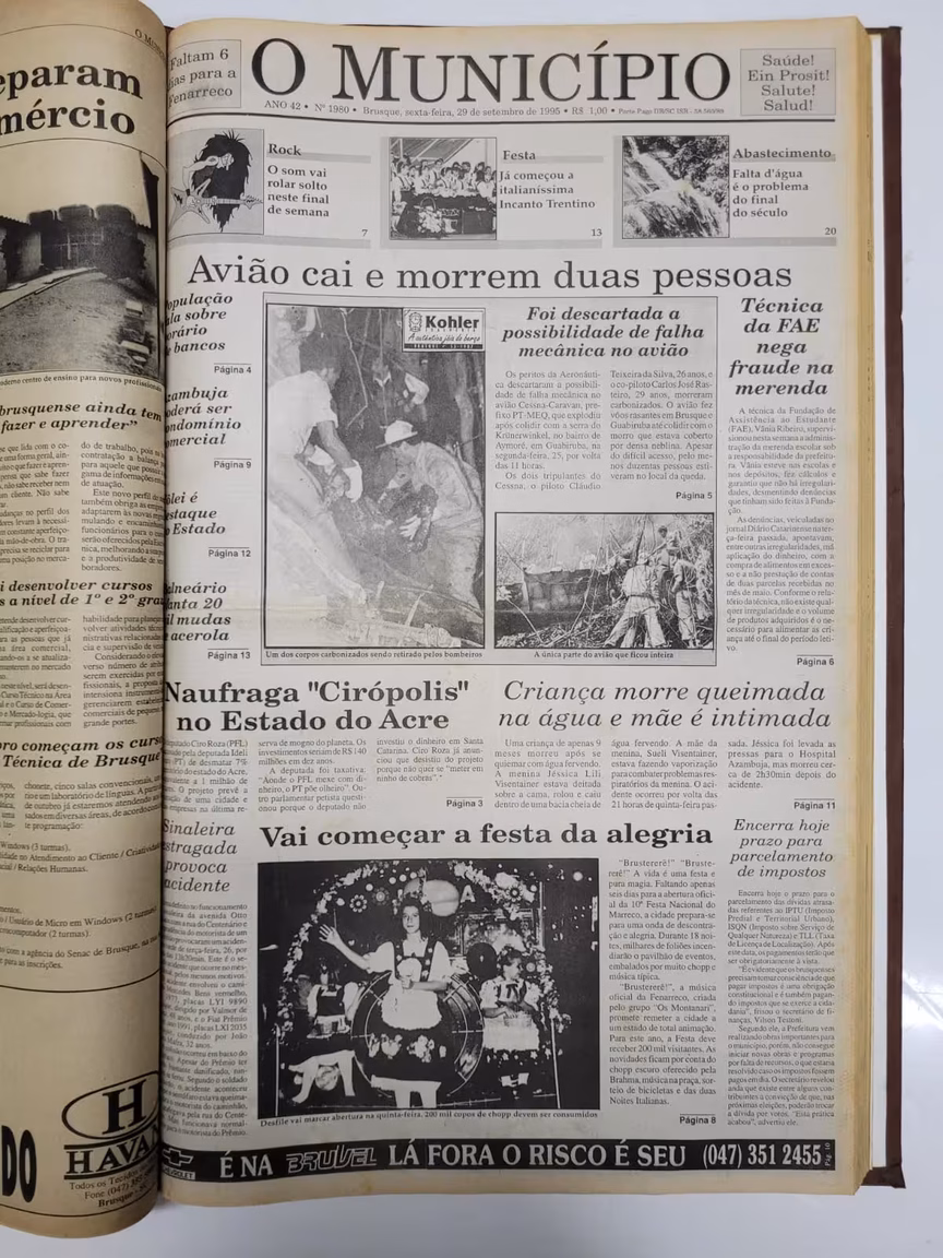 Uma notícia triste estampou a capa do dia 29 de setembro de 1995. O assunto em destaque foi a queda de um avião no bairro Aymoré, em Guabiruba. Duas pessoas morreram. O avião, na verdade, caiu no dia 25, então o jornal já abordou diretamente informações completas sobre o assunto: “Foi descartada a possibilidade de falha mecânica no avião” é um dos títulos da capa.