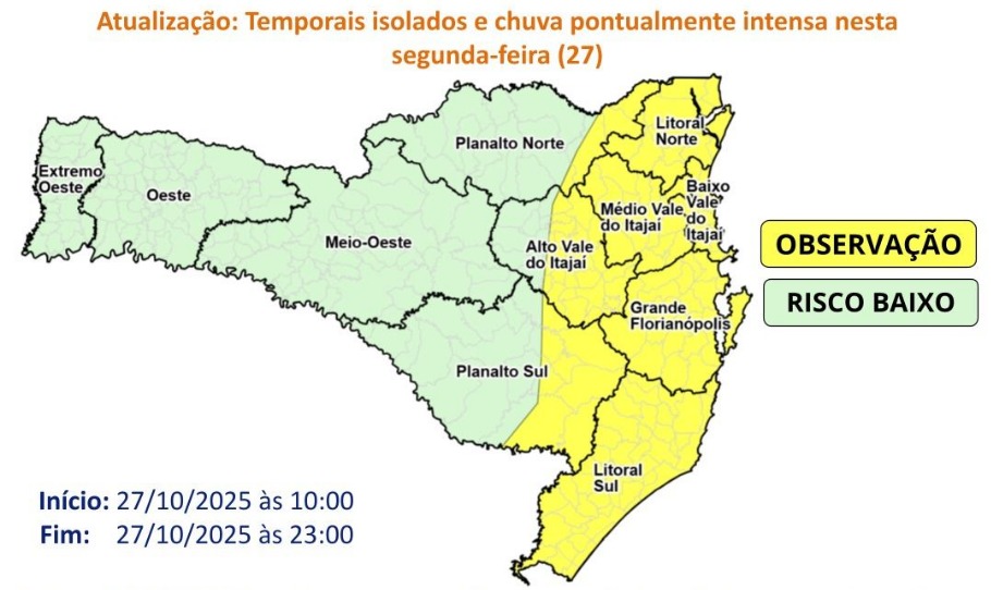 No Grande Oeste catarinense, entre a tarde e à noite há condições para temporais isolados, especialmente nas áreas de divisa com o Paraná. Esses temporais atingem poucos municípios, com risco baixo para alagamentos pontuais, destelhamentos, queda de galhos e árvores e danos na rede elétrica.