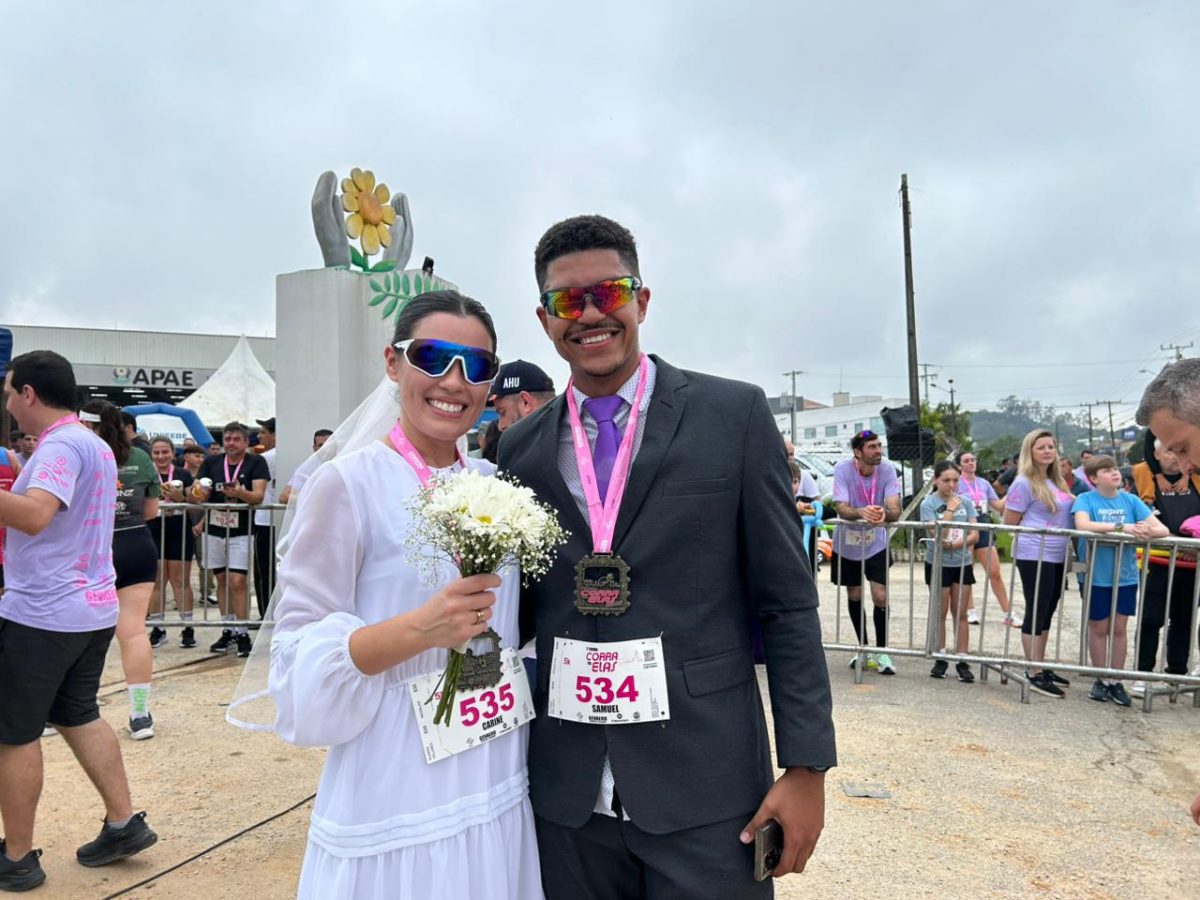 O amor também marcou presença na manhã de corrida. Samuel e Carine aproveitaram a data para iniciar as comemorações do casamento, que acontece no próximo fim de semana. “Foi desafiador por conta do traje, mas com certeza valeu a pena, porque a gente fez festa e já entrou no clima do grande dia”, disse Samuel.