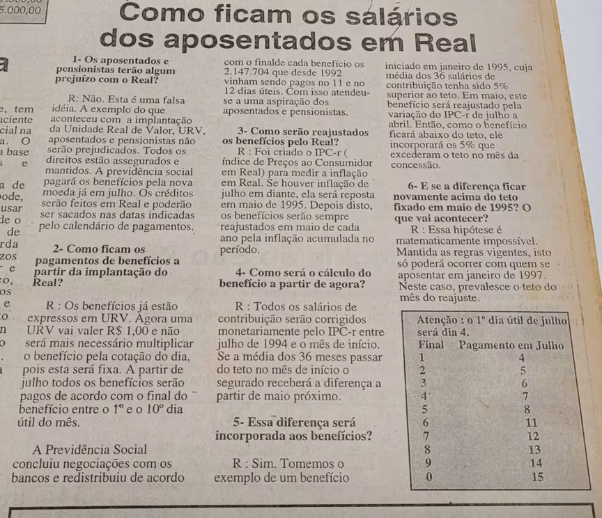 Uma preocupação da época era se o salário dos aposentados e pensionistas seriam afetados com a implantação do real. O conteúdo explicativo em forma de perguntas e respostas informava os moradores sobre o que aconteceria com os benefícios dos moradores.