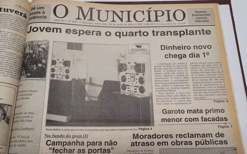 No dia 24 de junho de 1994, noticiado ainda de forma semanal, o jornal impresso de O Município trazia em uma de suas chamadas de capa “Dinheiro novo chega dia 1º”, que informava quando a distribuição das cédulas e moedas, já no formato de real, chegaria aos bancos de Brusque, neste caso, via Banco do Brasil.