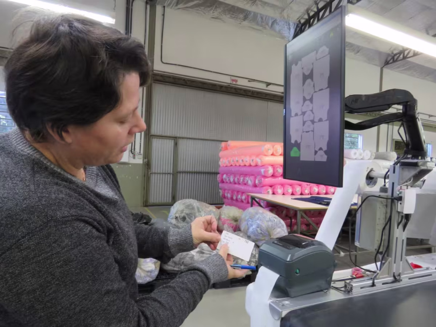 Com a implantação da inteligência artificial, todas as peças saem da máquina de corte e vão para as facções identificadas com uma etiqueta que indica todas as informações de cor, tamanho, modelo e lote, reduzindo a probabilidade de erros.