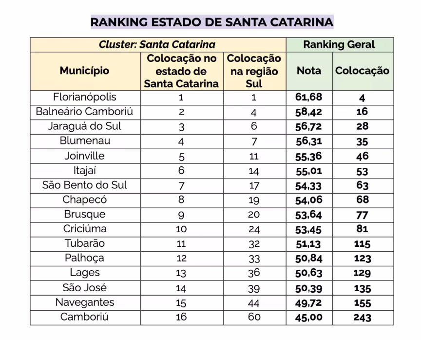 Anunciado nesta quinta-feira, 19, o Ranking de Competitividade dos Municípios analisa a capacidade competitiva das cidades brasileiras com mais de 80 mil habitantes. O estado de Santa Catarina se destaca com Florianópolis, que obteve a quarta posição no ranking geral. Brusque, ficou no 77º lugar ranking geral e em 9º na colocação no estado.