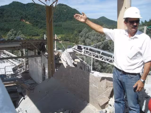 Ele explica que quando a empresa começou, mais da metade dos funcionários trabalhava na pedreira, na extração de rochas, puxando as pedras detonadas.