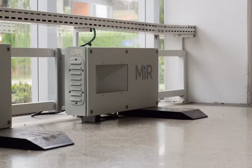 O robô utilizado pela Florisa possui autonomia para se recarregar automaticamente em estações de carregamento e segue rotas previamente programadas.