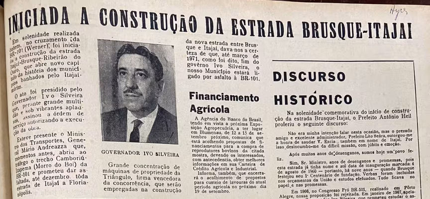“Em solenidade realizada no cruzamento da BR-101 foi iniciada a construção da estrada Itajaí-Brusque-Ribeirão do Ouro, que abre novo capítulo da história dos municípios banhados pelo Itajaí-Mirim”, noticia O Município na capa da edição do dia 22 de agosto de 1969.