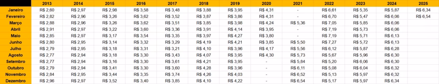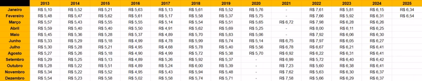 O levantamento não foi realizado pelos órgãos fiscalizadores em partes do segundo semestre de 2020 e primeiro semestre de 2021. Em 2022, os valores corrigidos ficaram entre R$ 7,61 e R$ 8 (o maior da série histórica), até caírem abruptamente a partir de julho, fechando dezembro equivalente a R$ 5,66. Nos anos seguintes, ficaram estáveis na casa dos R$ 6.