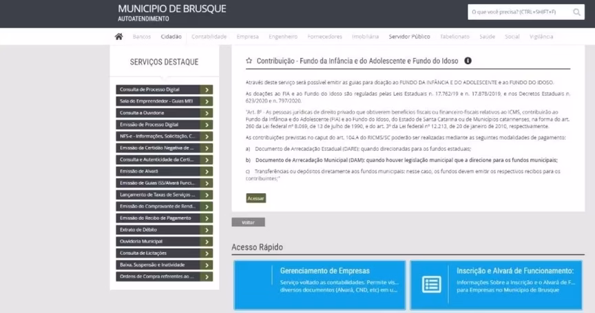 A prefeitura criou uma nova ferramenta para os empresários que querem ajudar as crianças de Brusque. A partir de agora os empresários que têm em suas empresas um regime tributário diferenciado (TTD) podem gerar suas guias de doação para o Fundo Municipal para a Infância e Adolescência (FIA) diretamente no site da Prefeitura de Brusque.