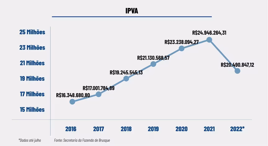 O Imposto sobre Veículos Automotores (IPVA) registra um crescimento de 52,6%. Em 2016, foram arrecadados R$ 16,3 milhões. Em 2021, o município arrecadou quase R$ 25 milhões.