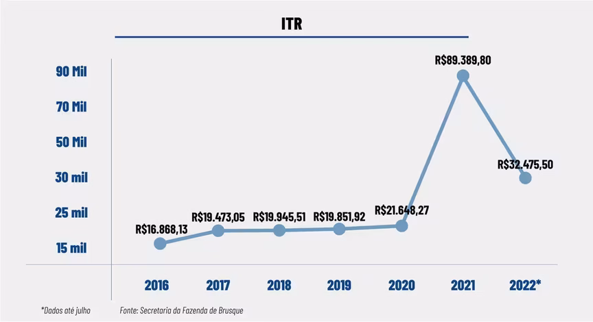 Em relação aos impostos, o tributo que registrou o maior percentual de crescimento na arrecadação, ao comparar os registros de 2016 com 2021, foi o Imposto sobre a Propriedade Territorial Rural (ITR). Em 2016, foi arrecadado R$ 16,8 mil e, em 2021, foi R$ 89,4 mil, portanto um aumento de 429,93%.