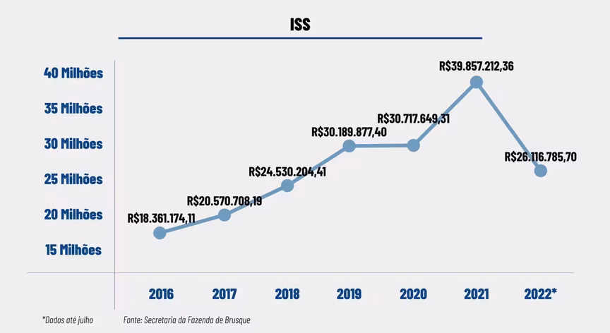 O Imposto Sobre Serviços (ISS) também teve um aumento expressivo: 117%. Em 2016, foram arrecadados R$ 18,3 milhões do imposto, já em 2021 foram arrecadados R$ 39,8 milhões.