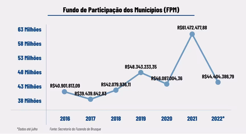 Em 2021, Brusque arrecadou quase R$ 474 milhões durante o ano, de acordo com dados da Secretaria da Fazenda municipal. São somados os impostos, além de programas e outras taxas. Até julho deste ano, o município já arrecadou mais de R$ 350 milhões.