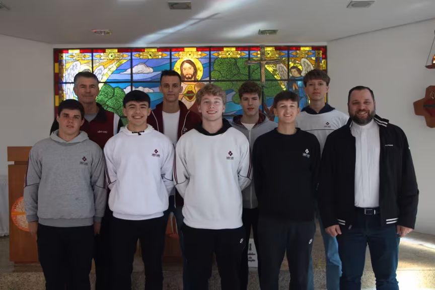 Os alunos Gabriel Henrique Rosin, Guinter Comper, Henrique Tachini Merico, João Vitor Schaefer Dell Agnolo, Lucas Muller Coelho, Lucas Werner Wandrey e Rian Heil, acompanhados do professor Luiz Armando Gulini, o Luizão, e do padre Diego Martins, terão uma experiência de três semanas no Séminaire du Sacré-Coeur, instituição de ensino da Congregação dos Padres do Sagrado Coração de Jesus.