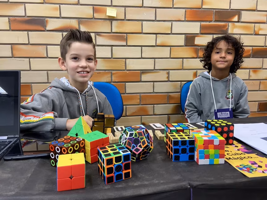 “Levei um cubo para a aula e eles se interessaram muito. Chegou em um nível muito elevado, eles só tem 8 anos, e descobriram que cada movimento executado no cubo tem um algoritmo. O cubo é matemática pura e desenvolve outros saberes também. Hoje, eles conseguem montar todos os cubos que estão aqui na feira. Eles executam os movimentos dos algoritmos e montam o cubo”, relata a professora Erica Garcia.