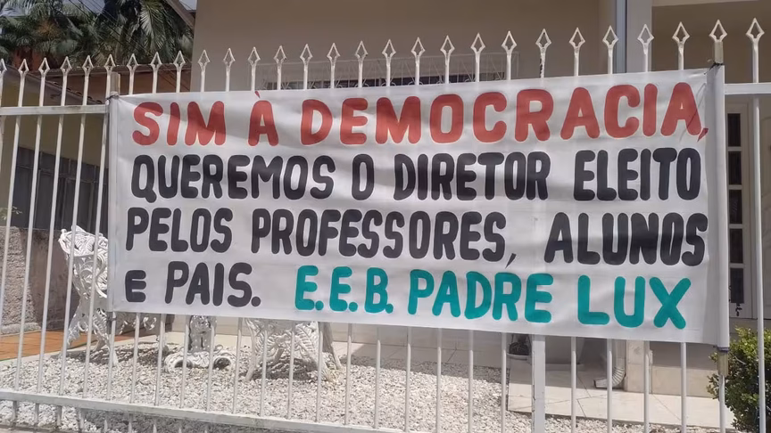 Pais de alunos e professores da Escola de Educação Básica Padre Lux, do Azambuja, estenderam faixas e cartazes em suas casas se manifestando contra a decisão da Coordenadoria Regional de Educação (CRE) de Brusque de indicar um novo diretor para a instituição após o número mínimo de votantes não ser atingido.