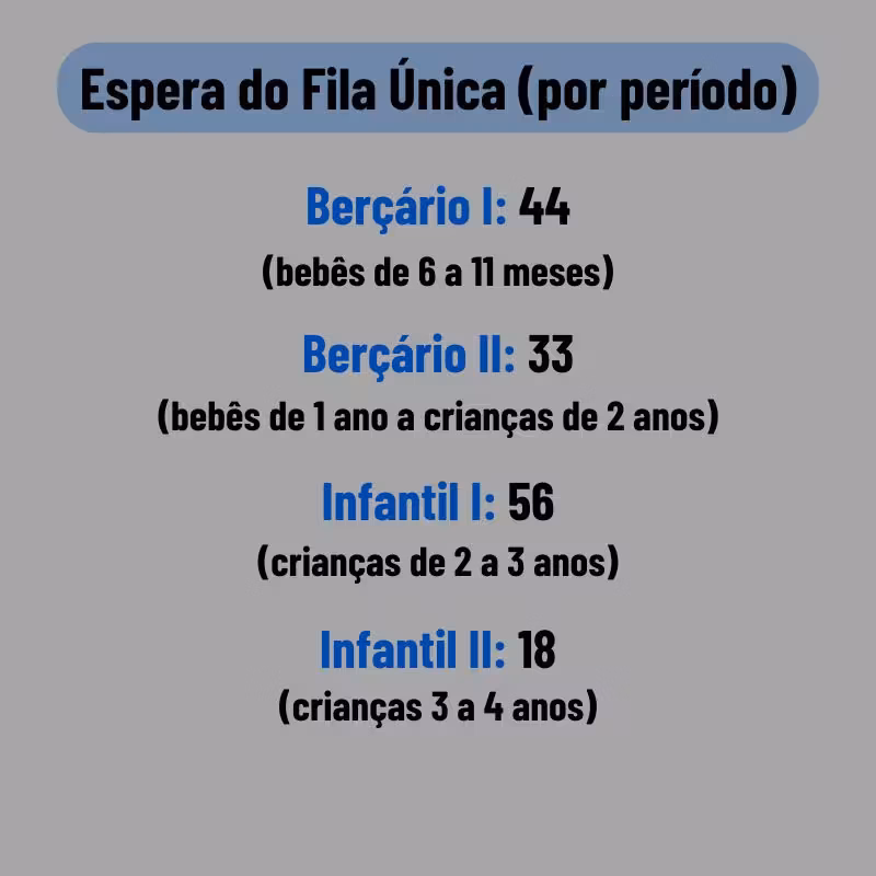 Já no Berçário II constam 33 bebês de 1 a 2 anos na fila. Por fim, há 18 crianças de 3 a 4 anos aguardando vagas no Infantil II.
