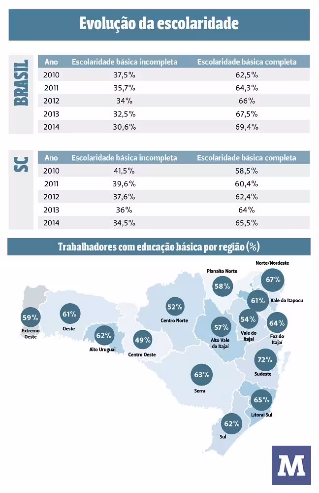 Em Santa Catarina, este índice é ainda maior: 34,5% não concluíram o ensino básico. Levando em consideração apenas a indústria, os índices também crescem. No Brasil, 42,9% dos trabalhadores deste setor têm escolaridade básica incompleta, enquanto que em Santa Catarina, esse índice pula para 45,6%. Assim, a oferta de mão de obra qualificada é reduzida e reflete em toda a economia brasileira. Para o assessor da Fiesc para o Movimento SC pela Educação, Antônio José Carradore, o problema da competitividade vem da base.
