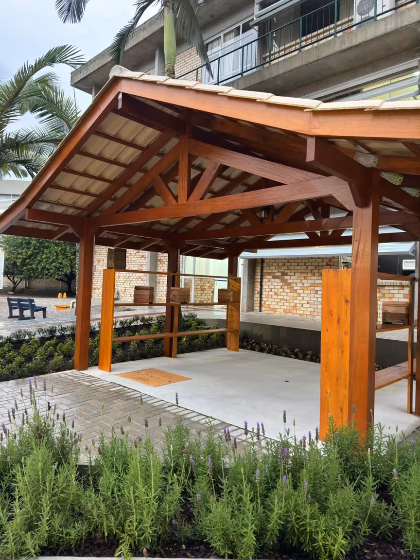 O espaço, com 32 m², foi construído com madeira tratada e é cercado por jardins com flores melíferas, oferecendo condições ideais para uma alimentação variada e nutritiva das abelhas.
